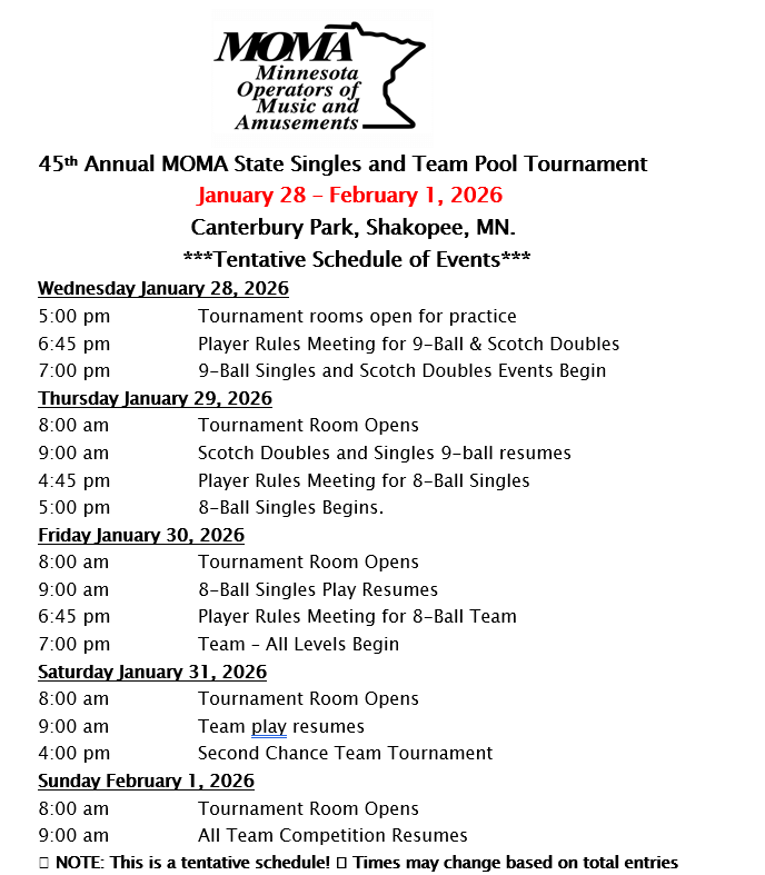 Thank you for submitting your registration for the MOMA Pool Tournament. Your registration and payment is complete.